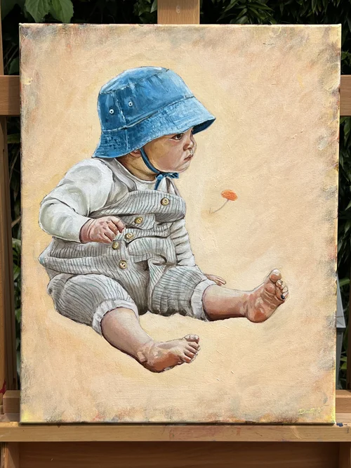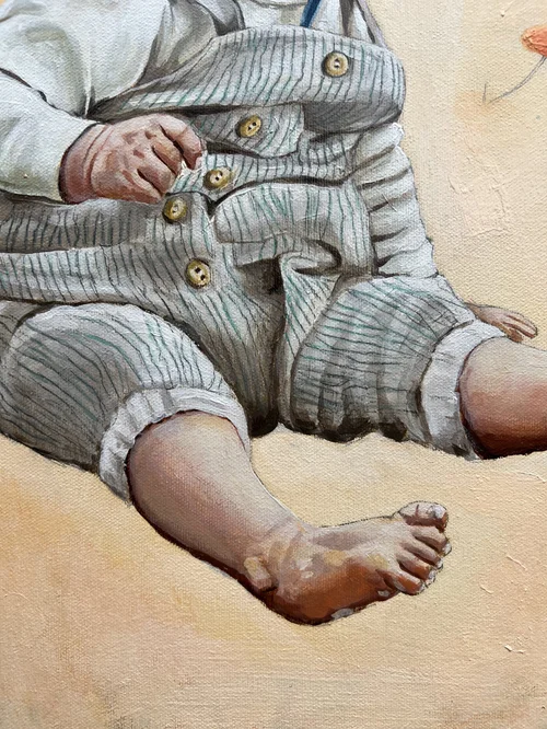 The canvas was under painted in a bright salmon colour and the final colour block is complimentary pastel blue. Initially I did consider keeping the background white, but as in the painting developed I gravitated more to a pastel blue colour.